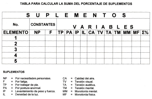 Véase las tablas de suplementos en el libro INTRODUCCION AL ESTUDIO DEL TRABAJO O.I.T.; 4a. EDICION REVISADA 2004; EDIT. LIMUSA, GRUPO NORIEGA EDITORES.